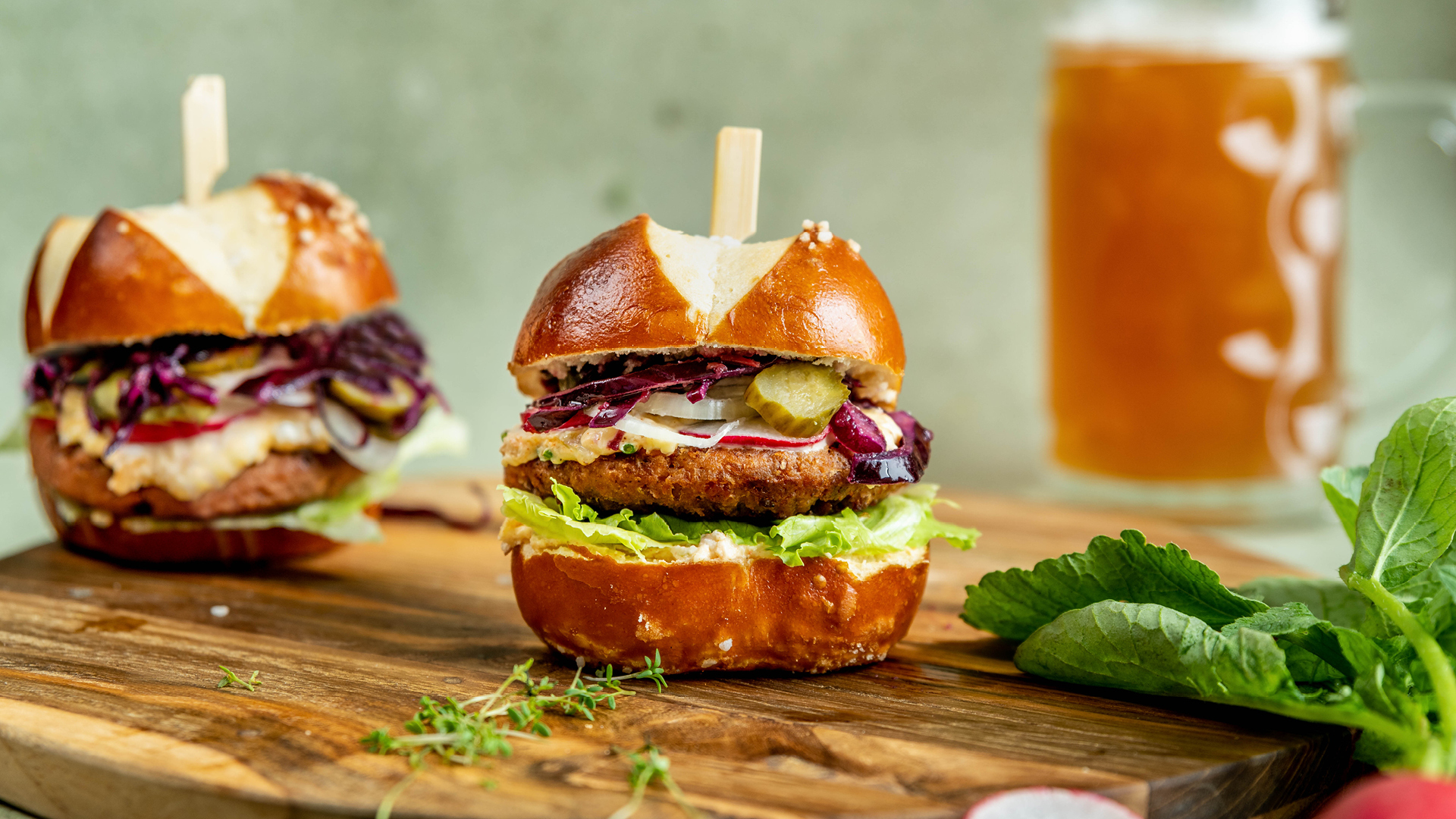 Laugensemmel halbieren und mit Obazda, Burgerpatty, Salat, Radieschen, Zwiebeln, Essiggurken und Rotkohlsalat belegen.