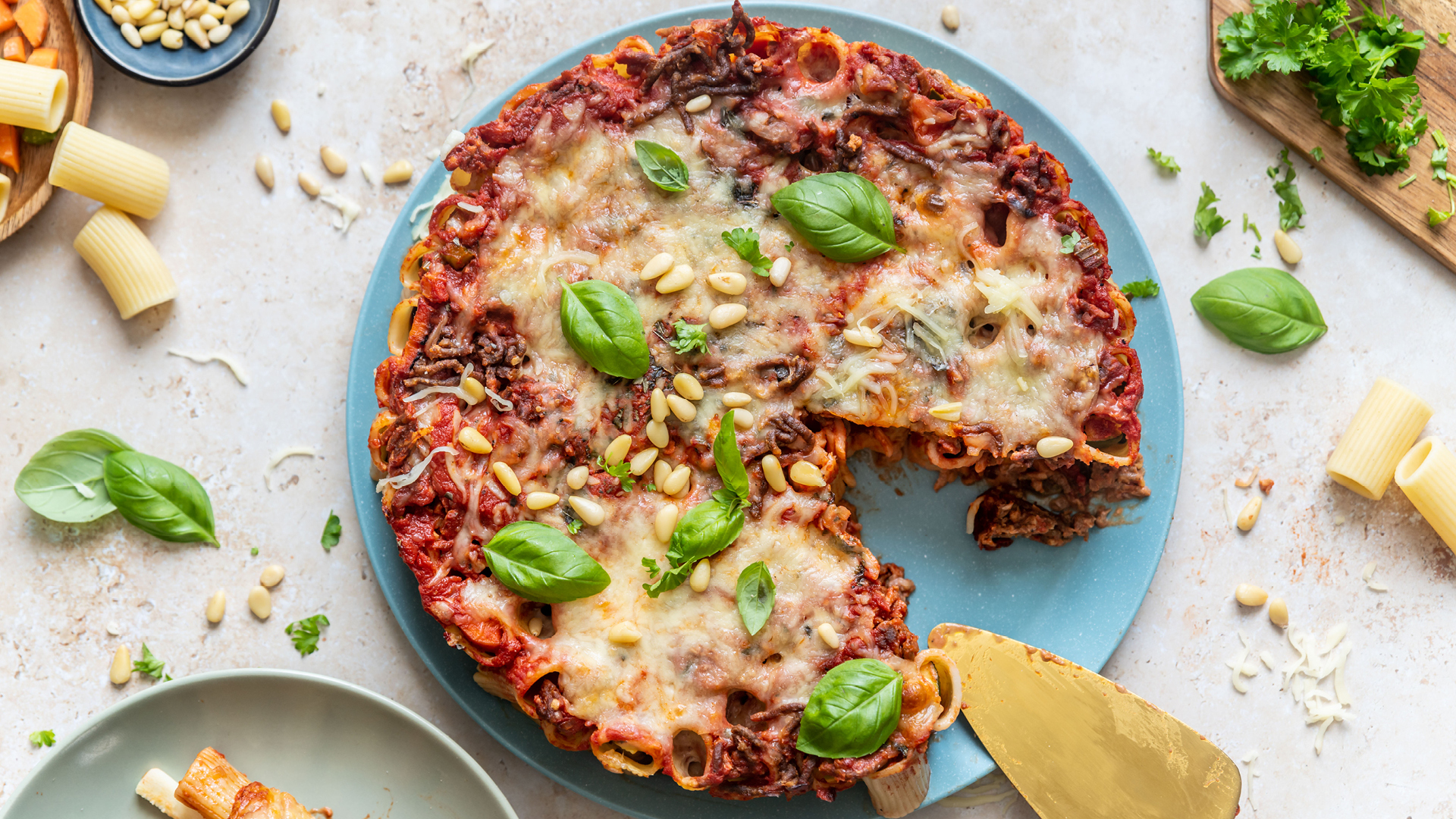 Die restliche Reibekäsealternative gleichmäßig auf den Nudeln verteilen. Den Pastakuchen bei 180°C für 30 Minuten im vorgeheizten Ofen backen. Herausnehmen, auskühlen lassen, den Rand vorsichtig mit einem Messer von der Springform lösen.