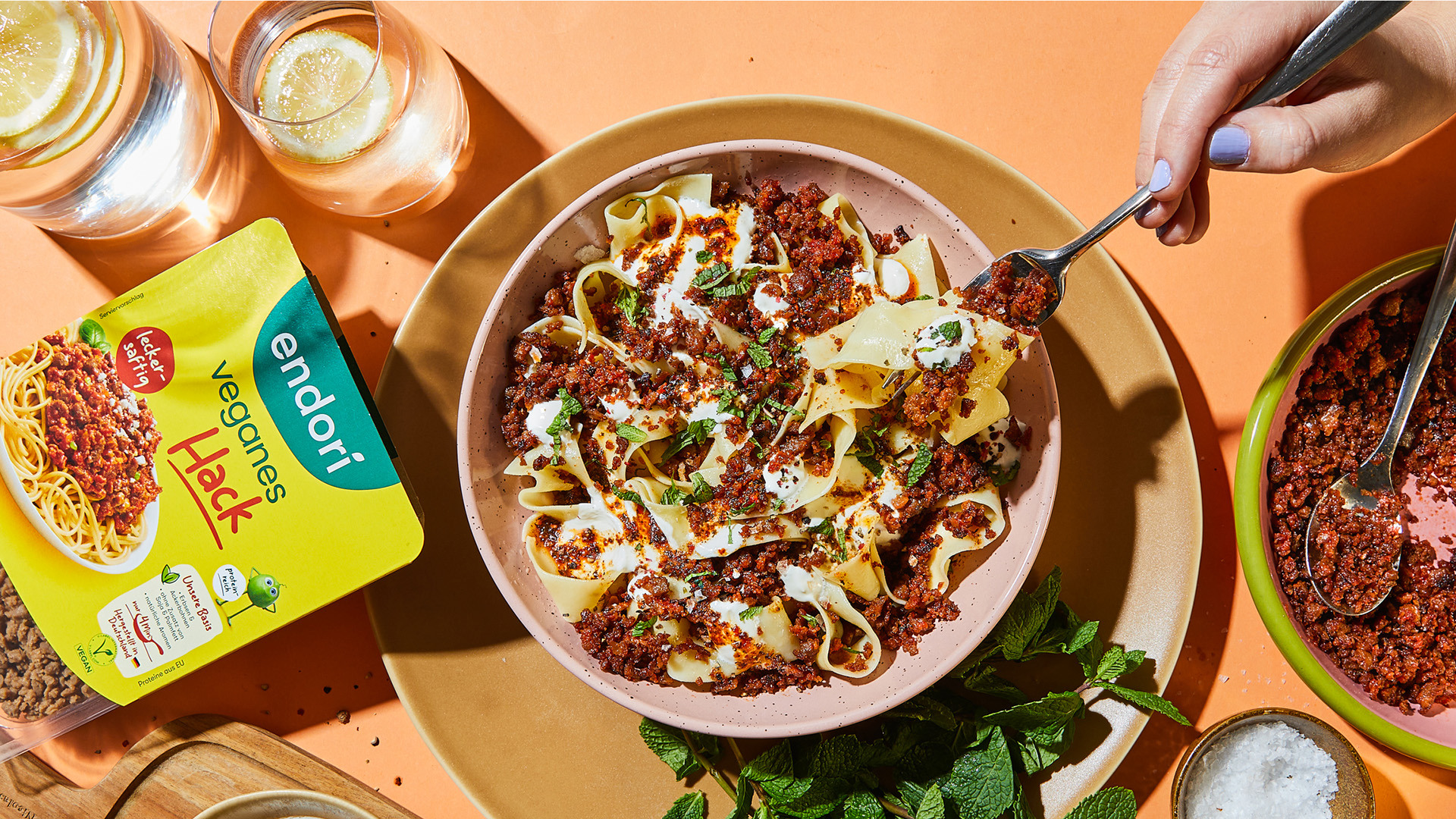 Die abgegossenen Nudeln auf tiefen Tellern anrichten und mit veganem Hack, Joghurtmischung und Kräuterbutter toppen.