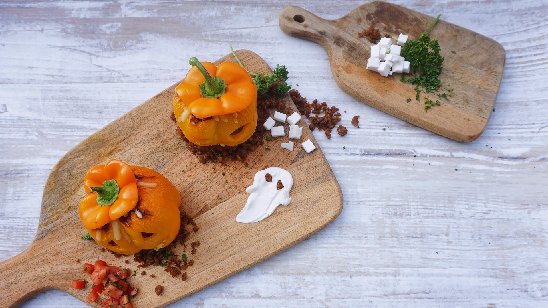 Die Paprikas waschen und wie bei einem Kürbis den Deckel abschneiden und absetzen. Dann die Paprika vorsichtig von innen säubern. In das saubere Gehäuse dann mit einem Messer ein Gesicht einschnitzen.