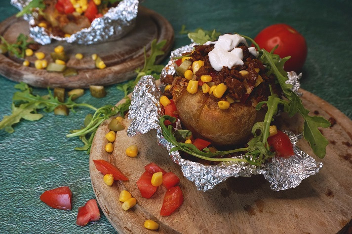 Zwei Kartoffeln in Alufolie wickeln und in den auf 200 Grad vorgeheizten Ofen legen. Kartoffeln nun 45 - 60 Minuten backen. Nach Bedarf früher herausnehmen oder länger im Ofen lassen.