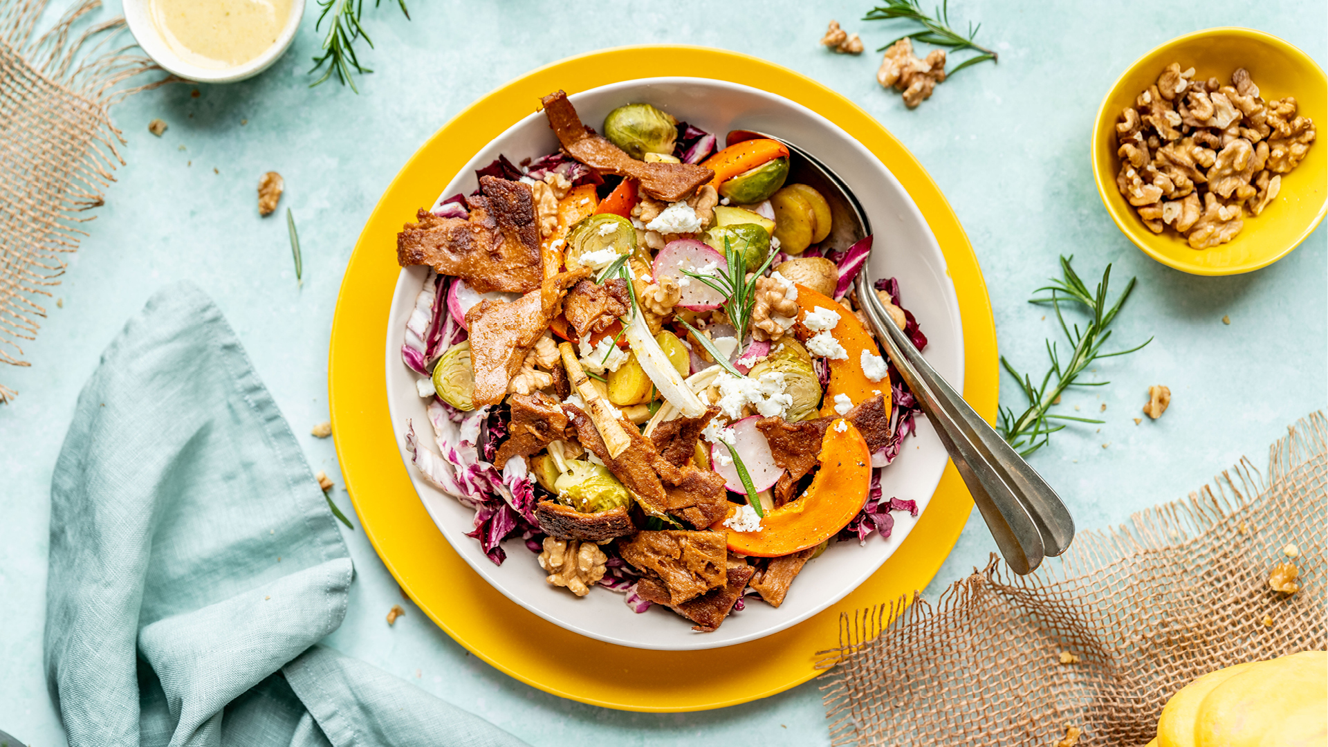 Radicchio waschen und klein schneiden. Gemeinsam mit dem Ofengemüse, endori veganes Chicken Kebab, Wahlnüssen und zerbröselter Schafskäsealternative in eine Schüssel geben. Gemeinsam mit dem Dressing vermischen und servieren.