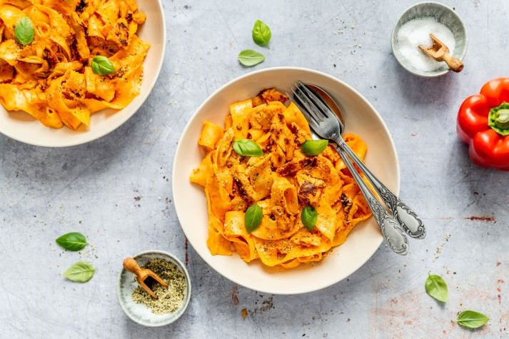 Gemüse aus dem Ofen nehmen. Gemeinsam mit veganer Cuisine und Hefeflocken in einem Mixer oder mit einem Stabmixer zu einer cremigen Sauce verarbeiten. Mit Gewürzen abschmecken.
