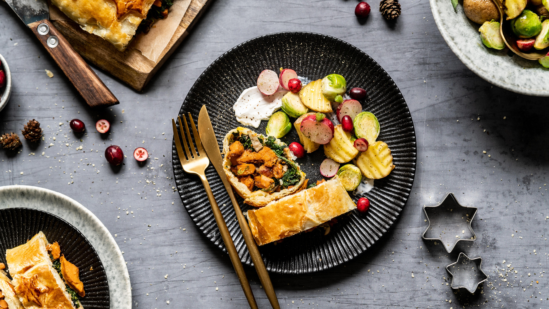 Gemüse und das Veggie Wellington gemeinsam servieren und genießen.